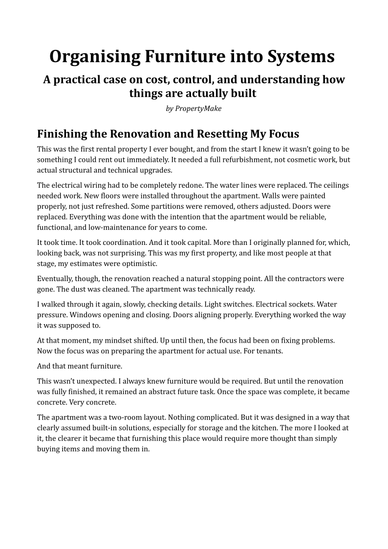 This case study explores how furnishing a rental apartment became a lesson in systems, margins, and control. By breaking the furniture process into design, production, and assembly, I reduced costs, shortened timelines, and gained long-term flexibility. The case shows how understanding how things are actually built changes how you invest.