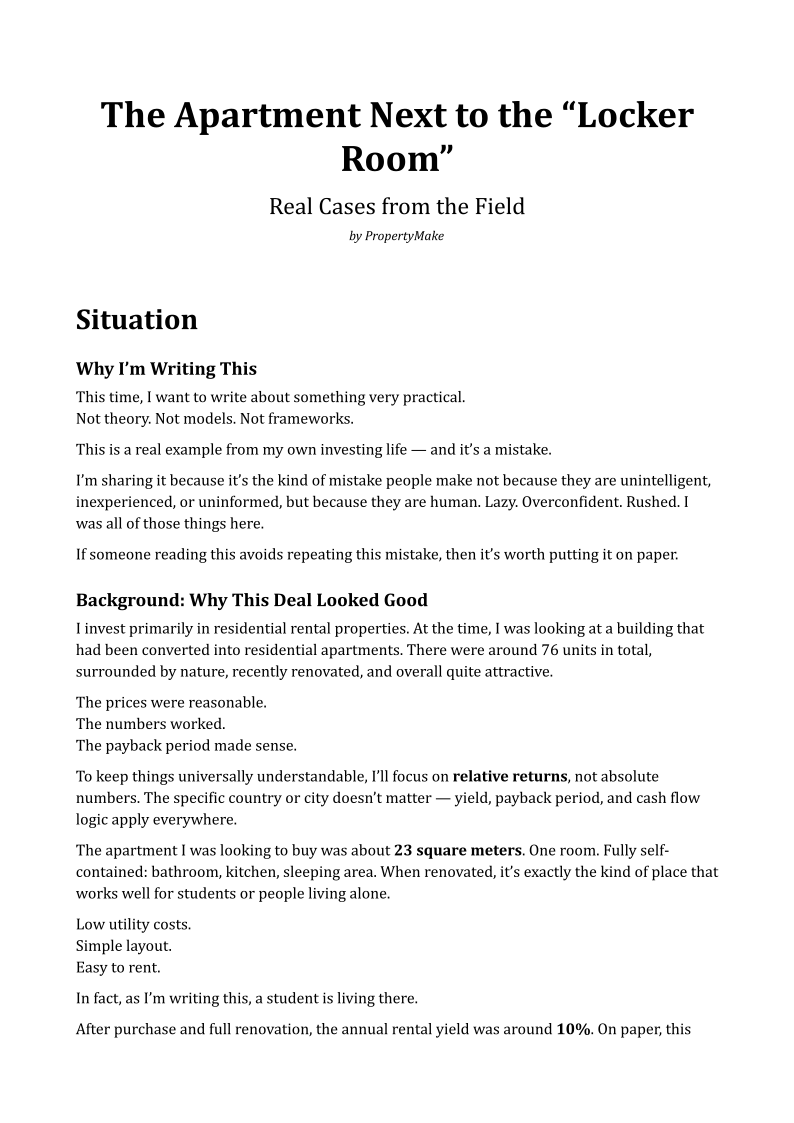 Rather than focusing on theory, this text walks through the full experience: the assumptions I made, the moment things started to feel wrong, and the consequences that followed. It shows how real estate mistakes often come not from lack of knowledge, but from overconfidence, convenience, and avoiding small discomforts.