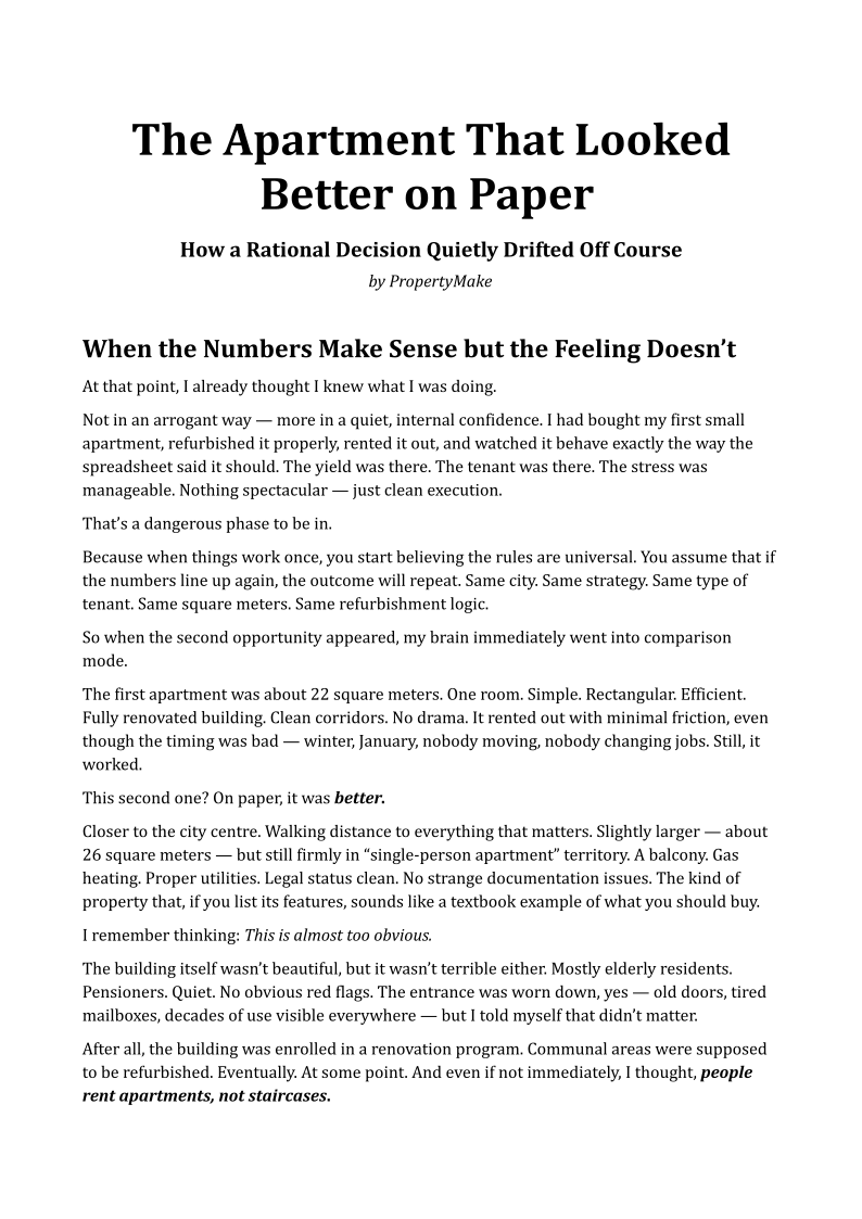 This case examines how a well-refurbished apartment with strong fundamentals underperformed due to one overlooked factor: the experience of getting to it. Despite a good location and solid design, negative impressions from the building’s common areas led to aggressive price negotiations, longer vacancy, and a materially lower yield. A lesson in mispriced risk and investor blind spots.